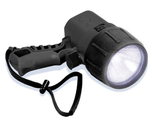 は、6W-LED塔載のハンド・ライトです。握りやすいピストル型グリップ付きで持ちやすいのが特長です。点灯・消灯方法は、回転切替式スイッチです。光の強さを6W(100%)、3W(50%)の切り替えができます。本体主材料は、プラスティック製です。電源は、単2アルカリ電池4本使用です。ストラップが付属です。 |
