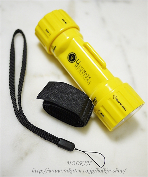 IPX-7 本体材質は頑丈なプラスティック製です。 ボディ部に巻付用のベルトフックが付いています。