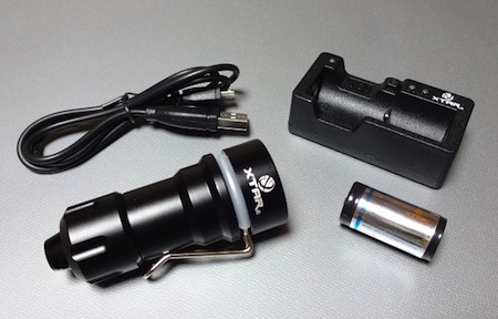 付属品:ランヤード・リング、予備Oリング、USB充電器(MC0)、充電池(RCR123)