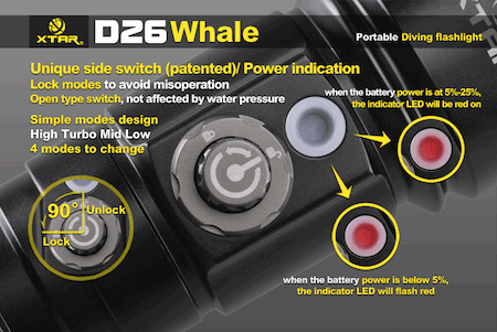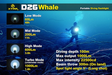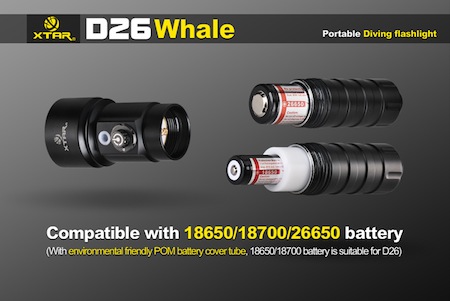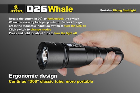 | 防水ライト XTAR D26 Whale ホエール【CREE XM-L U3 白色LED 搭載 / 明るさMAX:1000ルーメン/ 使用電池:18650 / 18700 / 26650 ×1本】 |