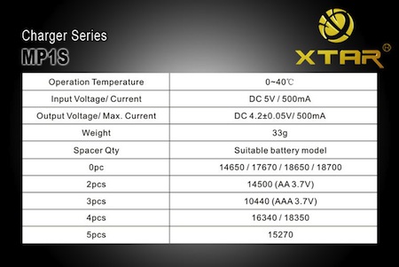 XTAR MP1S : USB電源充電器 【充電対応電池:10440/14500/14650/16340/17670/18350/18650/18700