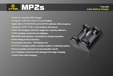 XTAR MP2S : USB電源充電器 【充電対応電池:15270/16340/18350 : 3.0V/3.2V, 3.6V/3.7V 】