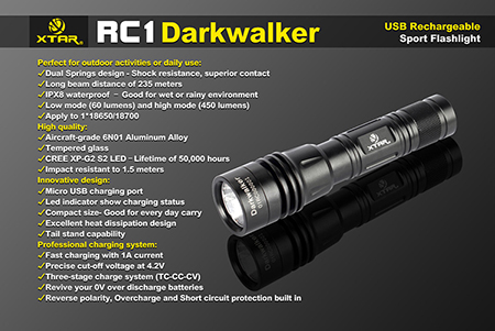 | XTAR RC1 Darkwalker【Cree XP-G2 S2 白色LED搭載 / 明るさMAX:450ルーメン/ 使用電池:18650×1本 or 18700×1本】 |