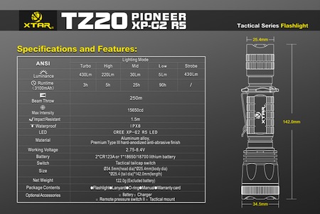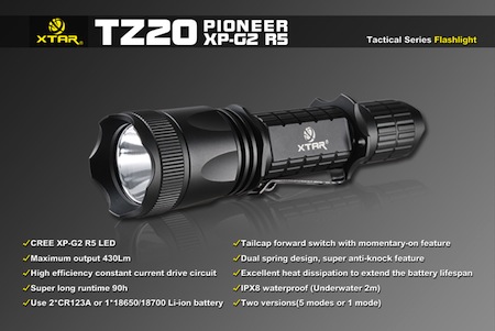 | XTAR TZ20 PIONEER XP-G2 R5 【明るさMAX:430ルーメン / CREE XP-G2 R5 白色LED 搭載 / 使用電池 : CR123×2本 or 18650 ×1本】 |
