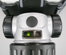 搭載のヘッドライトです。照射部に特殊レンズが搭載されており、集光性が高められています。点灯モードは、5パターン:100%→50%→25%→点滅(ゆっくり)→点滅(早く)に切り替えることができます。点灯・切替・消灯は、ヘッド部プッシュ・ボタンで操作します。電源は、単4型電池×3本使用です。ヘッド部は、角度調整ができます。電池残量が確認ができるバッテリー・インジケーターがついています。 |