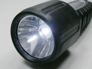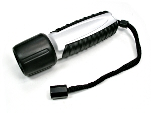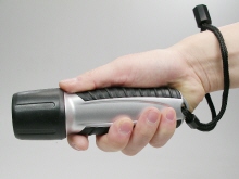 は、1W-LED搭載の防水ハンド・ライトです。手にフィットして滑りにくいラバーグリップを採用しています。電源は、単3アルカリ電池×4本使用です。点灯・消灯は、ヘッド部回転式です。ストラップが付属です。 |
